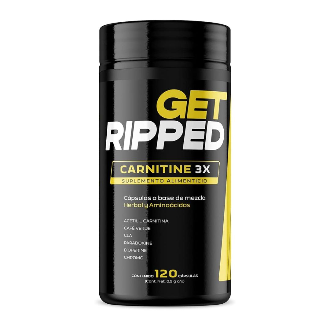 - Carnitine 3X Get Ripped es un suplemento alimenticio con 120 cápsulas a base de Acetil L Carnitina, Café Verde, CLA, Paradoxine, Bioperine y Cromo.