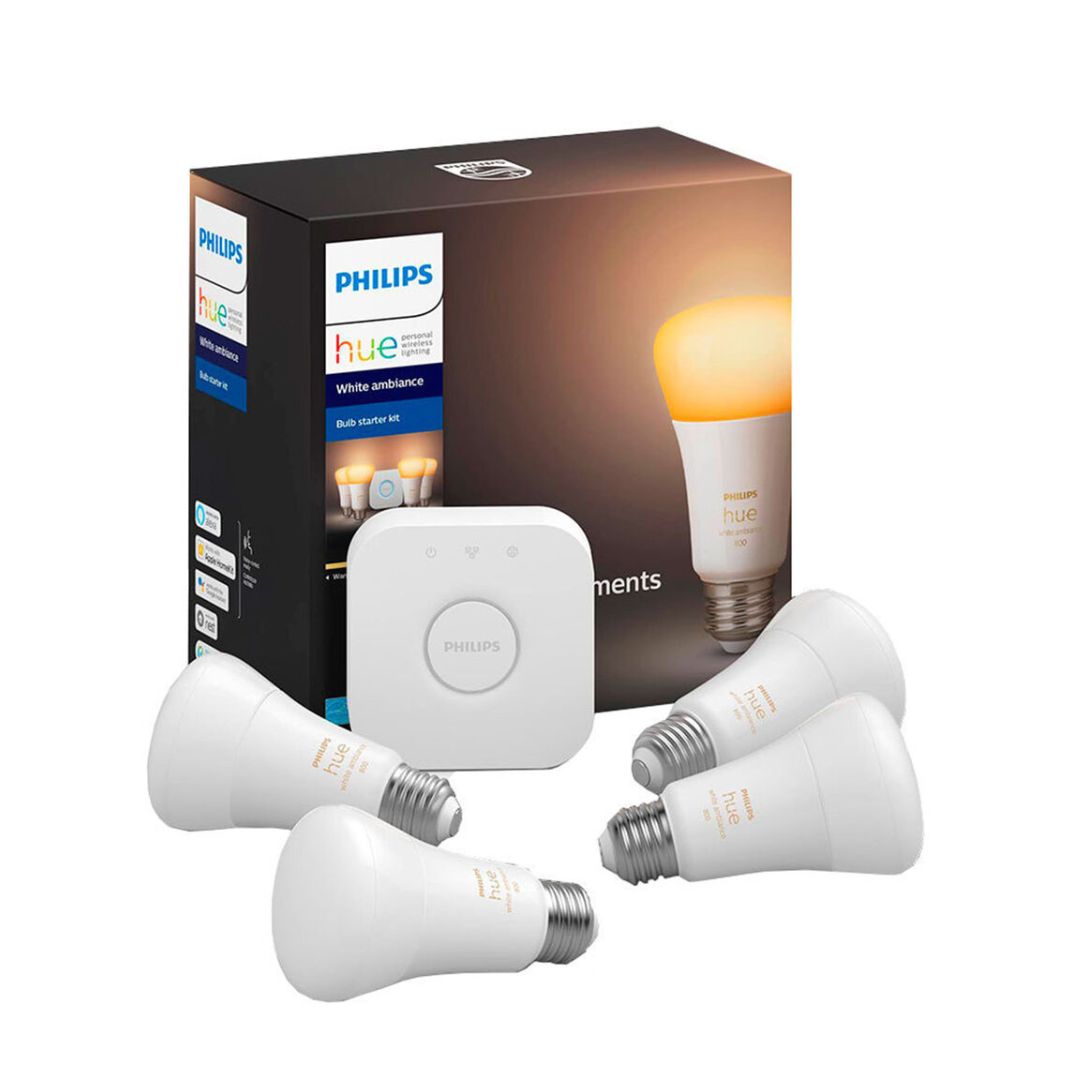 Set Philips de 4 focos Hue White Ambiance 7.5W + Hue Bridge. Obtén luz fría brillante, luz cálida, y todos los tonos intermedios con estos focos LED inteligentes. Apto para la mayoría de los luminarios, ofrece atenuación instantánea y distintos tonos de luz blanca cálida y fría.
